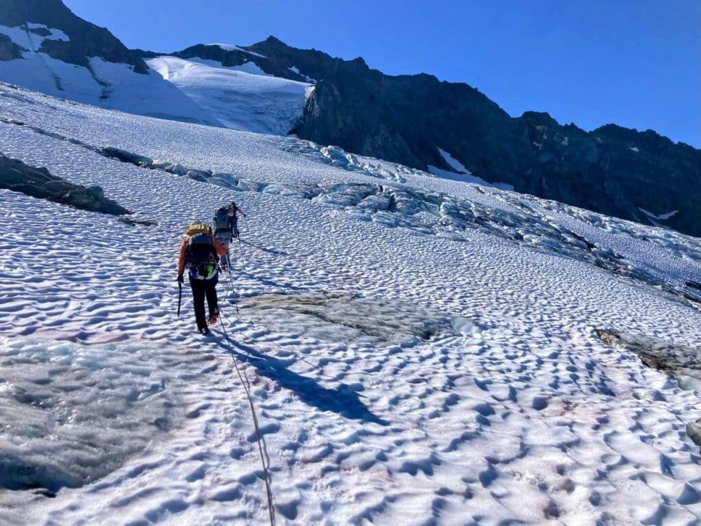 Throughout the season, we’ll introduce new skills, you’ll get to practice them, and then we’ll apply them while moving through the mountains. We’ll climb two different alpine routes during different summer months, so you’ll have opportunities to see how our decision-making responds to changing snow and glacier conditions. You’ll also receive individual coaching while navigating through varied terrain, which we think is one of the most underrated climbing skills.